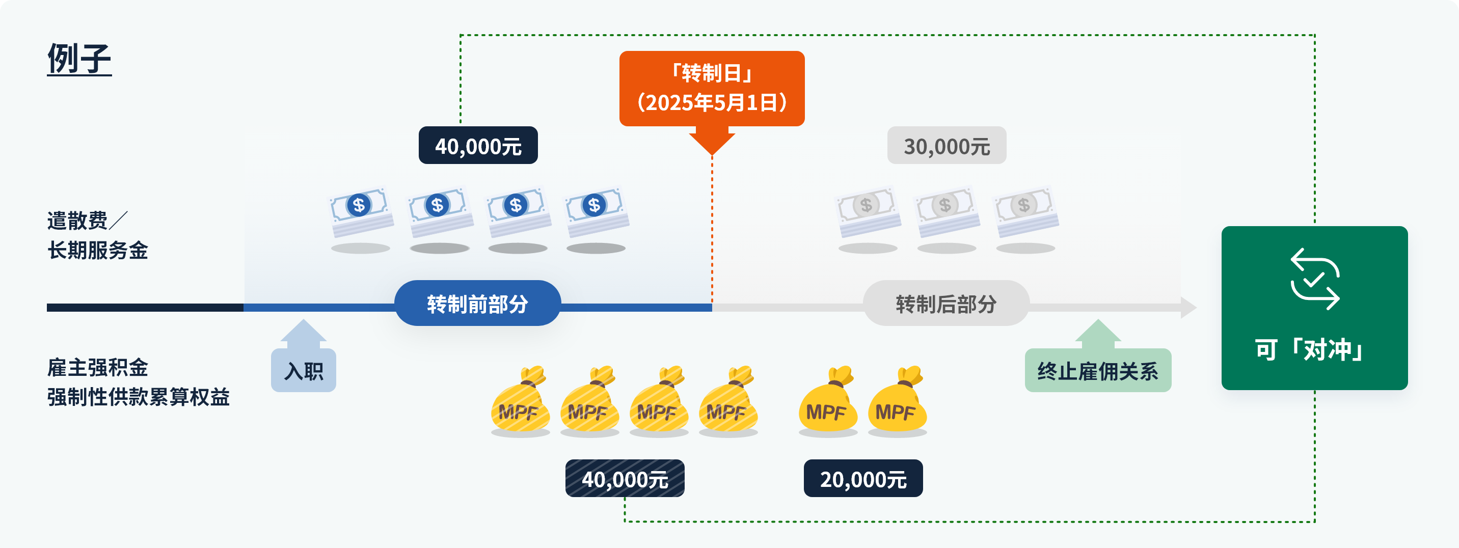 =遣散费/长期服务金转制前部分 + 遣散费/长期服务金转制后部分 +「对冲」后保留的雇主强积金强制性供款累算权益