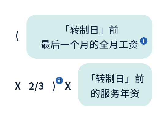 遣散费/长期服务金会以「转制日」为界,分为转制前 (即「转制日」前的受雇期)及转制后 (即「转制日」起的受雇期)两部分。
