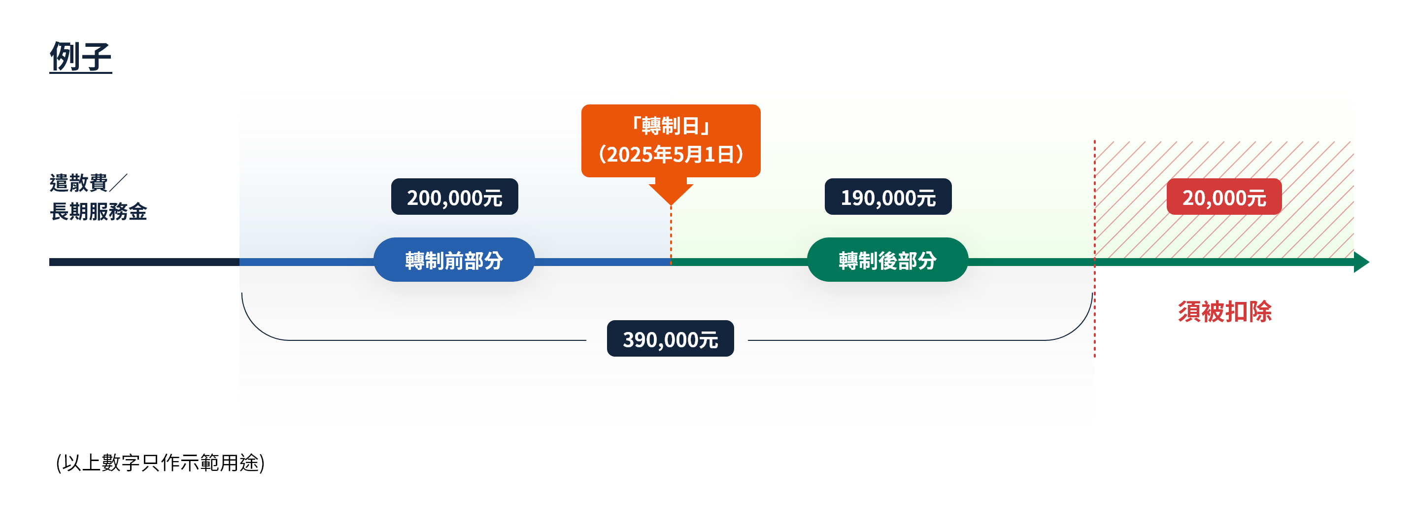遣散費/長期服務金會以「轉制日」為界,分為轉制前 (即「轉制日」前的受僱期)及轉制後 (即「轉制日」起的受僱期)兩部分。